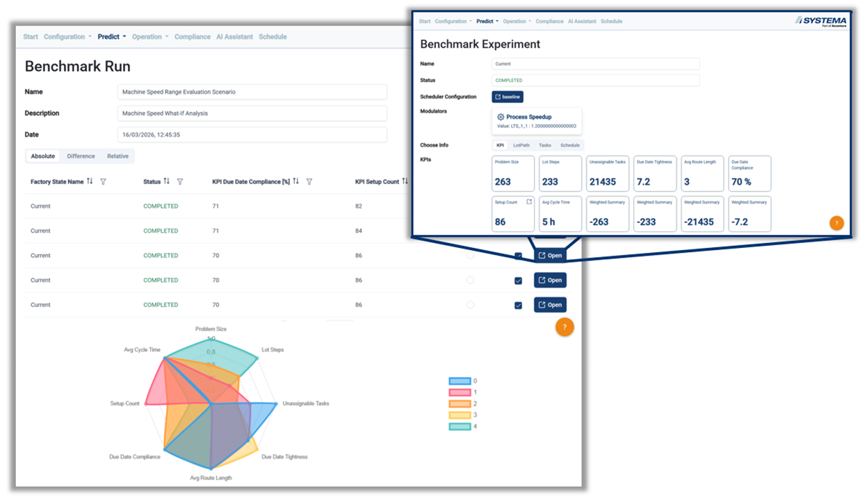 SYSTEMA APS extends its predictive scheduling platform with Decision Cockpit capabilities that make scenario evaluation more systematic, more reproducible, and easier to operationalize. Building on the benchmarking refinements introduced in v2025.3, this release strengthens the full workflow around experiments, KPI scorecards, and controlled execution—so industrial engineering teams can prove improvements offline before rolling them into line control.